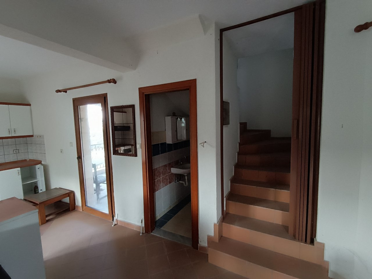 Πρώτος όροφος: Σαλοκουζίνα με ενιαίο σχέδιο, προσφέροντας μια άνετη και ζεστή ατμόσφαιρα. Στο ίδιο επίπεδο υπάρχει και το μπάνιο.